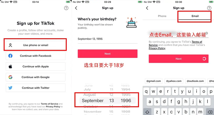 打开TikTok应用后,开始注册你自己的TikTok账号,可以选择用邮箱或者手机号(不支持国内手机)注册,为了账号的安全与稳定,推荐大家建议使用邮箱进行注册,填写有效的邮箱地址并接收验证码,注册的时候记得年龄大于18岁。建议使用Outlook邮箱或者Gmail等国外邮箱,以确保验证码能顺利接收,没有国外邮箱的网友可以在下方的链接去购买,
