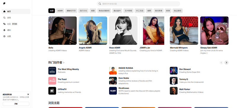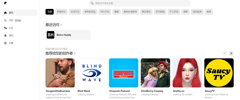 4. 然后我们就可以进去来搜索观看我们喜欢的博主了,如果你没有付费订阅 Patreon 博主,只能看到他们主页里很有限的内容。在你付费订阅后,才能看到更多内容。
