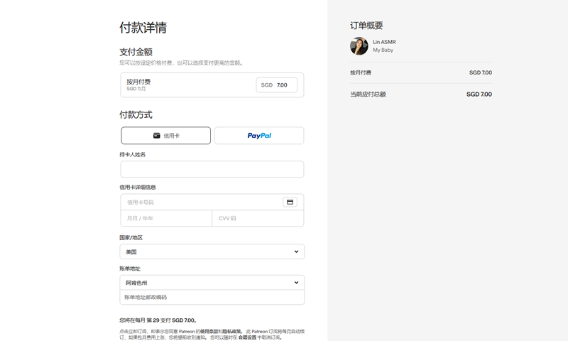 4、需要你填写信用卡信息,虚拟信用卡只需要:卡号,有效期,和CVV,账单地址就可以绑卡付款订阅,需要卡的小伙伴可以在下方的链接进行购买。