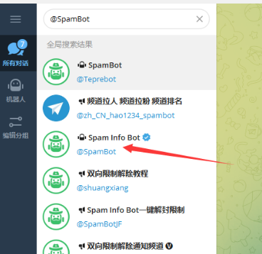 当系统弹出限制提示时,点击“更多信息”可跳转到官方解除限制机器人。或者直接在电报里面搜索框搜索“@SpamBot”,找到并添加该机器人,一定要认准蓝标的那个,这个是官方专门用来处理这些事情的机器人。
