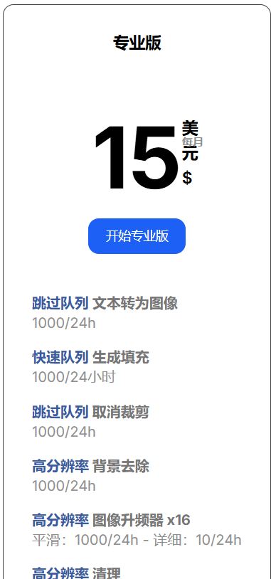 一个月Clipdrop会员($15) 一个月Clipdrop会员+账号 三个月Clipdrop会员($45) 六个月Clipdrop会员($90) 一年Clipdrop会员($180) | |
