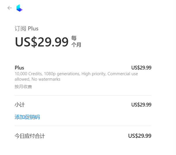 (2)Plus 计划:每月收费 $29.99,包含 10,000 个积分,支持高优先级处理,允许商业用途,生成内容无水印。