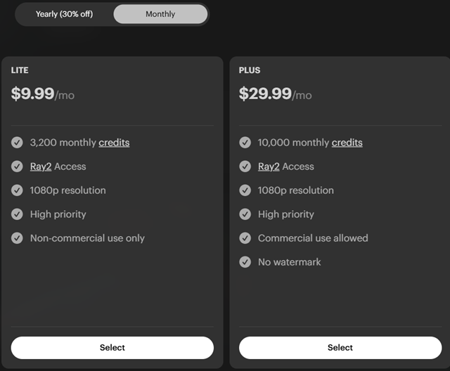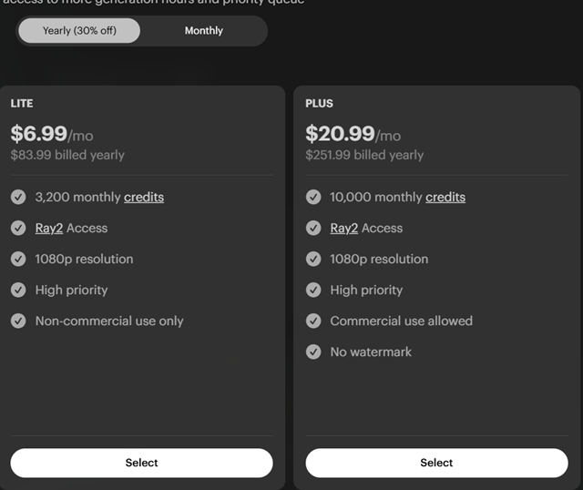 (1)免费计划:每月提供有限的免费生成次数,适合个人用户体验基本功能。Lite 计划:每月收费 $9.99,包含 3,200 个积分,支持 1080p 图像和 720p 视频生成,优先处理,适用于非商业用途,生成内容可能包含水印。