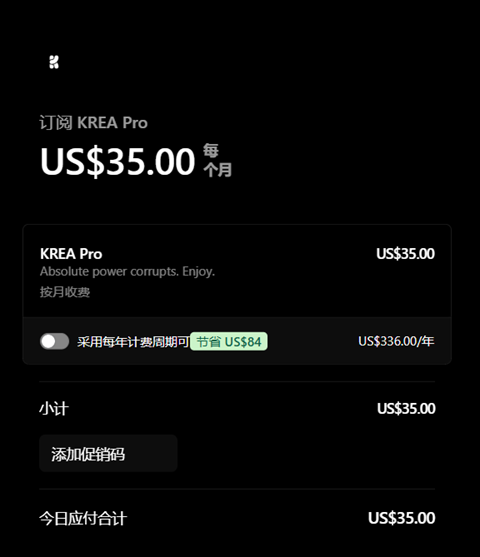 1个月Krea basic会员($8) 1个月Krea Pro会员($35) 1个月Krea Max会员($60) Krea basic年会员($96) Krea Pro年会员($336) | |