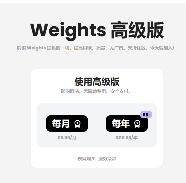Weights Premium会员/1个月($9.99) Weights Premium会员/3个月($39.99) Weights Premium年会员($99.99)1400 | |