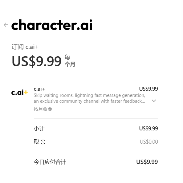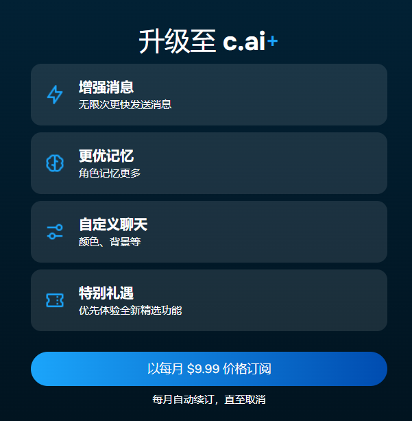 Character AI 提供一种付费订阅计划,通常被称为 Character AI Plus(C.AI+),会员享受更快的响应速度、更少的等待时间等特权。