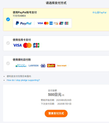 4、进入支付页面:确定支持档位后,点击 “赞助” 按钮进入支付页面。