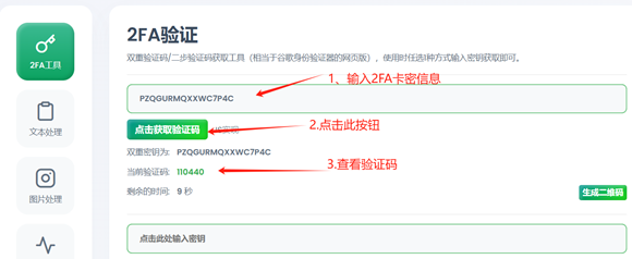 4.去到验证码输入界面,去网址 https://2fa.run/,复制卡密第3项(2FA秘钥),生成六位数字验证码
