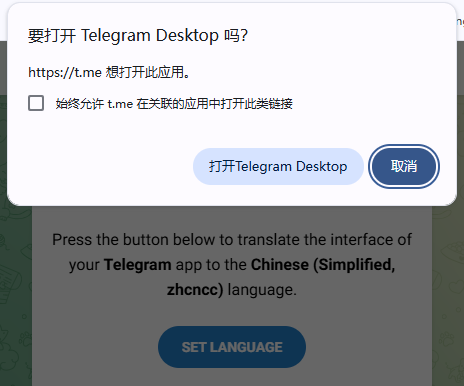 (3)点击弹出的“打开Telegram Desktop”,电脑会自动打开Telegram软件