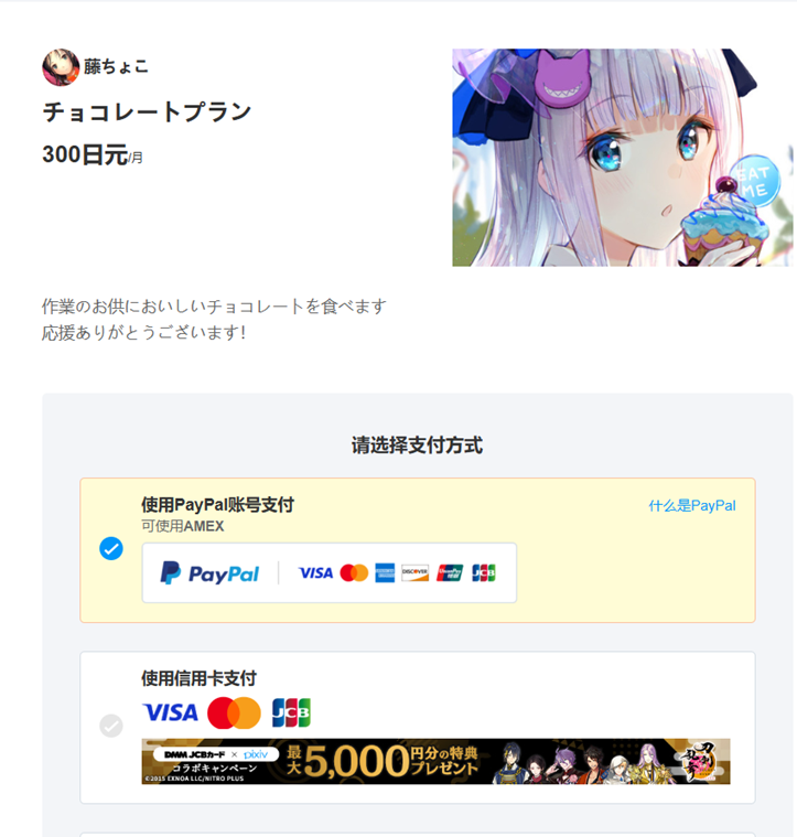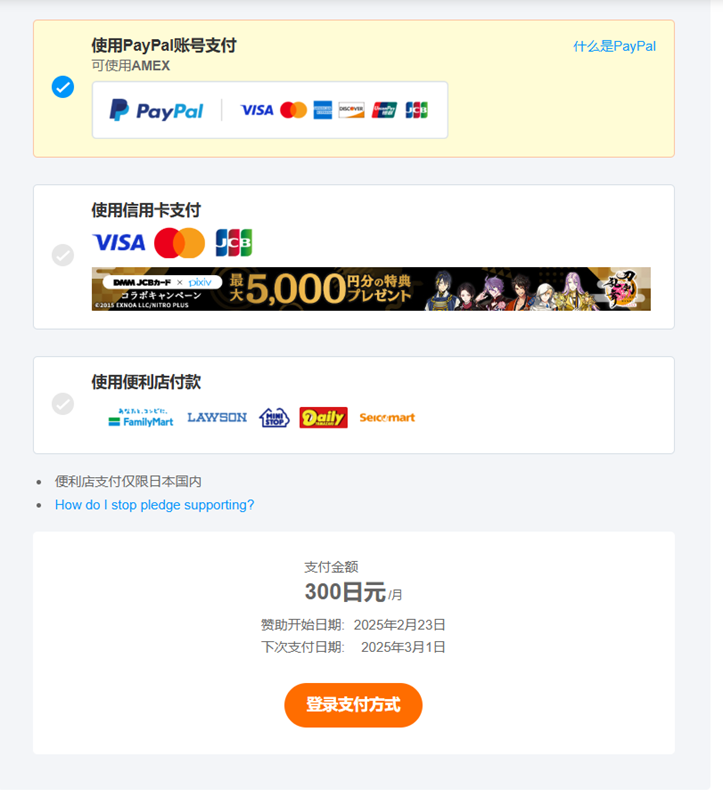 • Pixiv Fanbox 支持多种支付方式,包括信用卡、PayPal 等。你需要选择一种支付方式并完成支付。