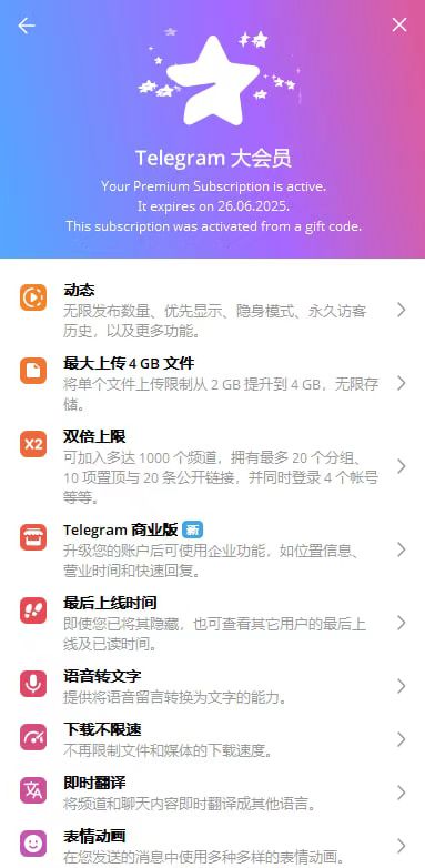 Telegram 高级版 直充 3个月 Telegram 高级版 直充 6个月 Telegram 高级版 直充 12个月 Telegram优质账号+3个月会员直充 Telegram优质账号+6个月会员直充 Telegram优质账号+12个月会员直充 | |